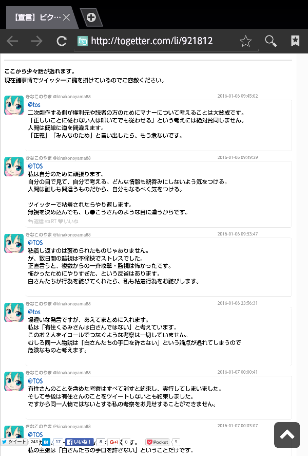 ・きなこのやま氏がまとめ作成以前に白氏に絡めて有住くるみ氏への執拗な粘着行為を行う・有住くるみ氏はそれを無視していたが上記Togetter上で「謝るように」ときなこのやま氏が呼びかけを行ったことをきっかけに「自分もターゲットにされているのか?心当たりがないので止めてほしい」とコメント